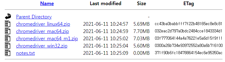 크롬드라이버를 검색하여 해당버전 드라이버를 찾아 운영체제에 맞게 다운로드 한다.